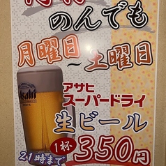 月~金、日、祝日、祝前日: 17:00~翌0:00 (料理L.O. 23:30 ドリンクL.O. 23:30)土: 17:00~翌2:00 (料理L.O. 翌1:30 ドリンクL.O. 翌1:30)